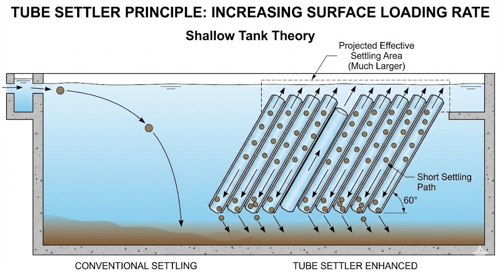 Tube Settlers použiť sériu naklonených šesťuholníkových kanálov na zlepšenie účinnosti usadzovania pevných látok v čističi. Zväčšením efektívnej usadzovacej plochy (na základe Hazensov zákon alebo teória plytkých nádrží ), tieto moduly umožňujú časticiam padať na veľmi krátku vzdialenosť predtým, ako narazia na stenu trubice a skĺznu na dno.