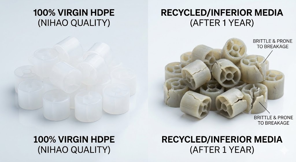 100% panenský HDPE (High-Density Polyetylén) je preferovaný, pretože ponúka vynikajúcu mechanickú pevnosť, chemickú odolnosť a správnu hustotu (0,95-0,97 g/cm3) pre fluidizáciu. Recyklované materiály často obsahujú nečistoty, ktoré spôsobujú krehkosť média alebo jeho klesanie, čo vedie k zlyhaniu systému do 2-3 rokov.