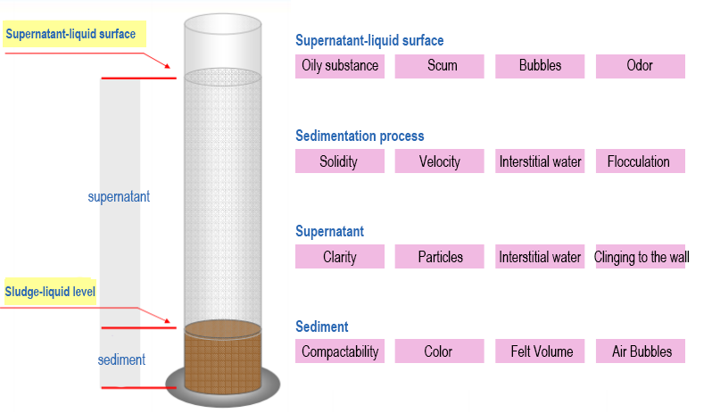 | Jasnosť | Celková sýtosť (farba) a zákal. | 1. Úroveň zaťaženia (čím vyššia, tým horšia); 2. Stupeň prevzdušnenia (nadmerné prevzdušnenie vedie k zlej prehľadnosti); 3. Či je kal otrávený (otrávený kal má za následok zlú čírosť); 4. Vláknitý objem (číry). |