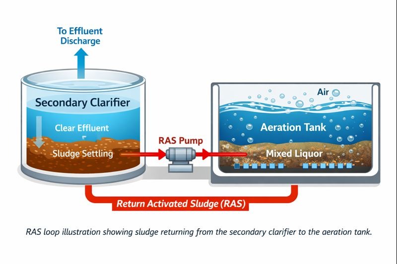 RAS vracia usadený kal do biologickej nádrže na udržanie biomasy a kapacity spracovania. WAS odstraňuje prebytočný kal, aby kontroloval vek kalu (SRT) a zabránil hromadeniu kalu. Spoločne RAS a WAS udržujú systém aktivovaného kalu stabilný a efektívny.